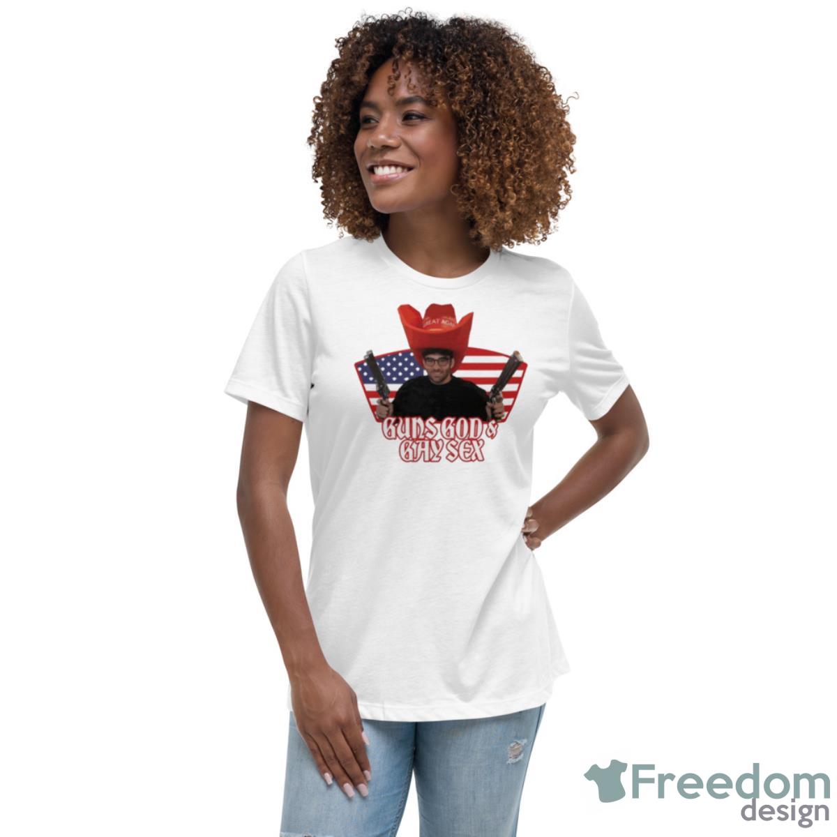 The Guns God And Gay Sex Shirt is available in a range of sizes, so you can find the perfect fit for your body type. The shirt is also unisex, making it a great option for anyone who wants to make a statement with their fashion choices.