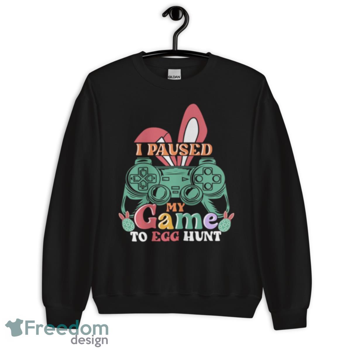 The slogan “I Paused My Game To Egg Hunt” is emblazoned across the top of the graphic in bold letters, making it clear to everyone around you that you’re a serious gamer who also knows how to have fun during the Easter holiday.