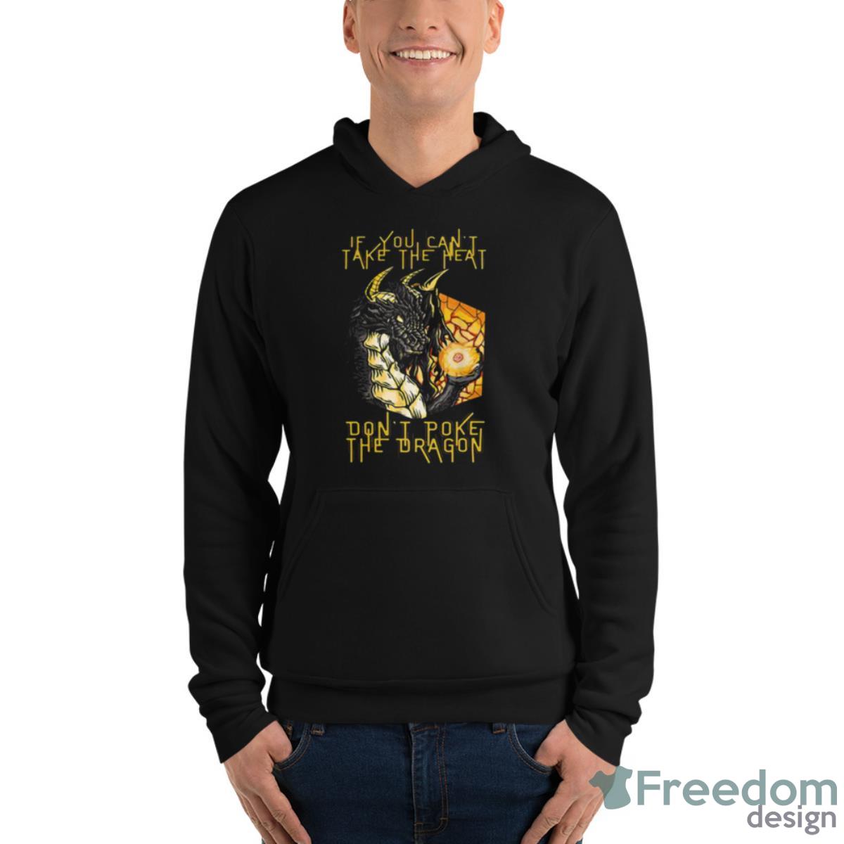 Crafted from high-quality materials, this shirt is incredibly comfortable to wear and will last you for years to come. The black fabric serves as the perfect backdrop for the bold and eye-catching graphic on the front. Featuring a fierce and fiery dragon with the words “If You Can’t Take The Heart Don’t Poke The Dragon” emblazoned across it, this shirt is sure to turn heads and start conversations.
