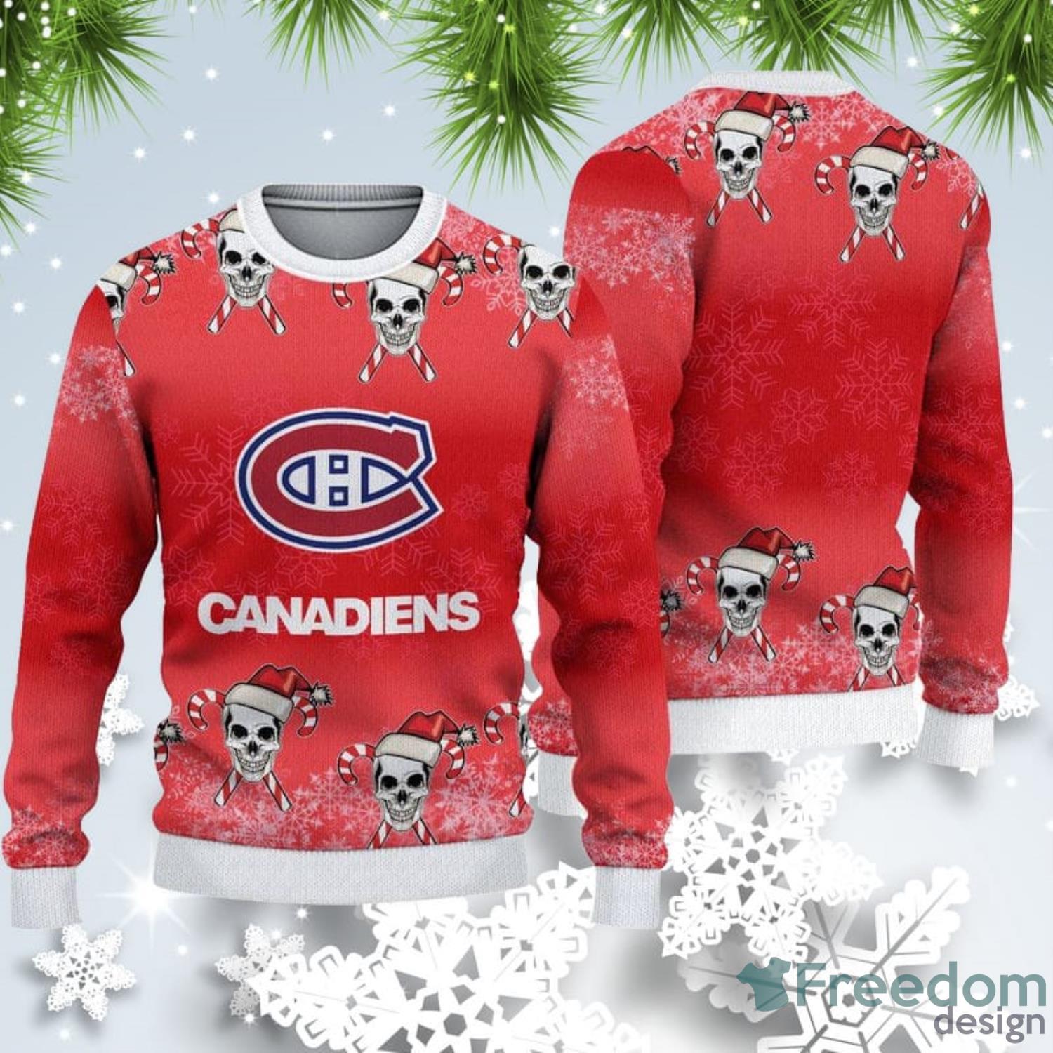 Looking for a festive and unique way to show your holiday spirit this year? Check out this Montreal Canadiens Christmas Skull Ugly Christmas Sweater! This one-of-a-kind sweater is sure to get you noticed at any holiday party or gathering. It features the iconic Canadiens logo in the center of a skull design, with red and white accents to really make it stand out. Whether you’re a die-hard Habs fan or just looking for a fun and festive way to show your holiday spirit, this Montreal Canadiens Christmas Skull Ugly Christmas Sweater is the perfect choice!