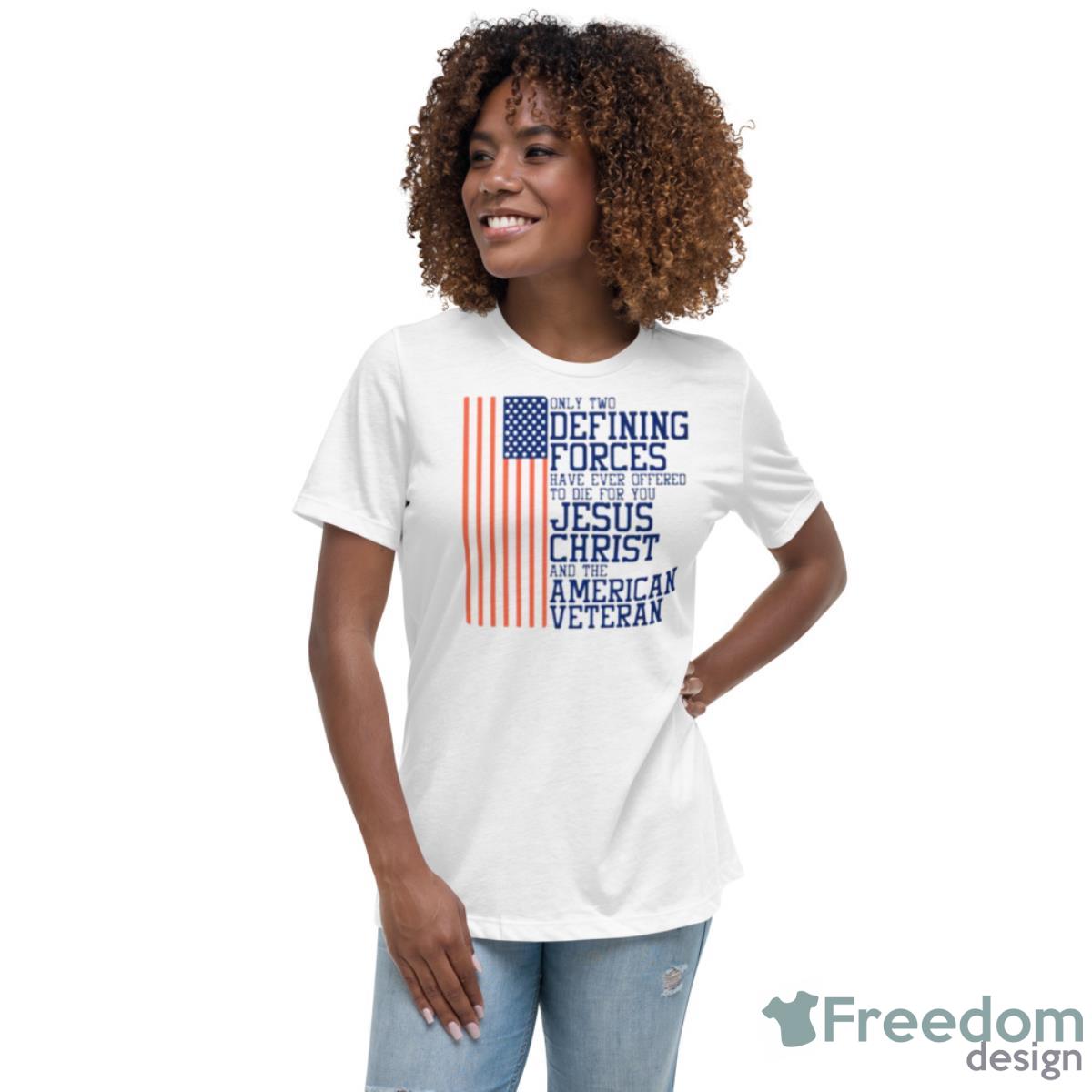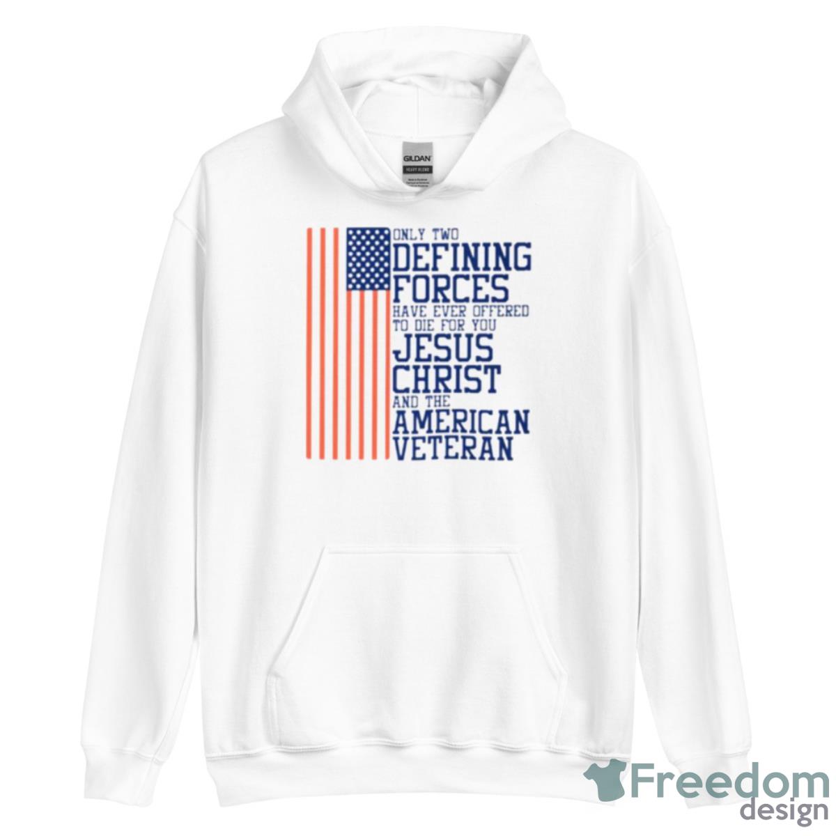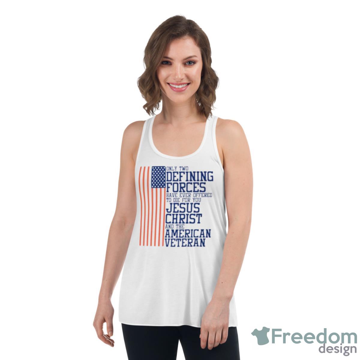 Only Two Defining Forces Have Ever Offered To Die For You Jesus Christ And The American Veteran USA Flag Shirt Details