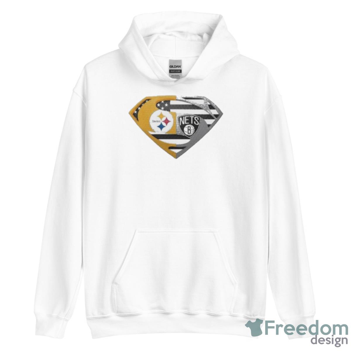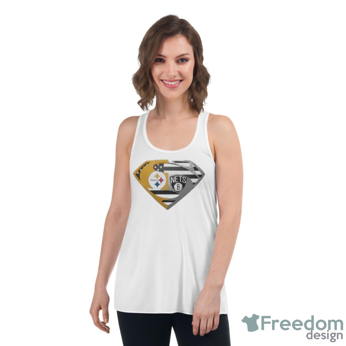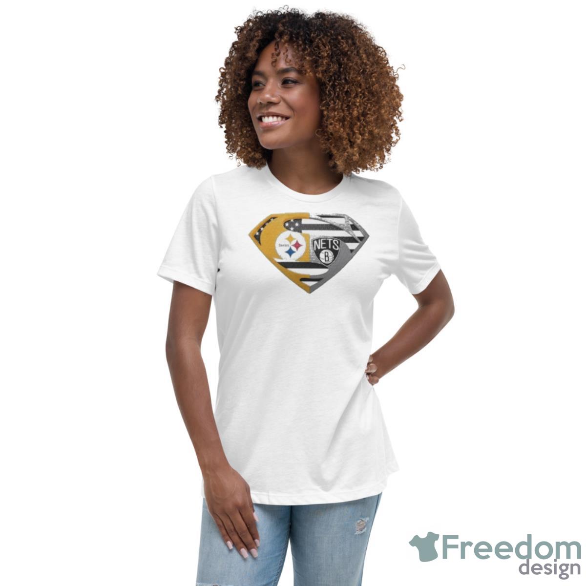 Featuring the iconic Superman logo emblazoned over the top of the US flag, this shirt is a true statement piece that will make you stand out from the crowd. The Pittsburgh Steelers and Brooklyn Nets logos are prominently displayed on either side of the shirt, showcasing your dedication to these storied franchises.