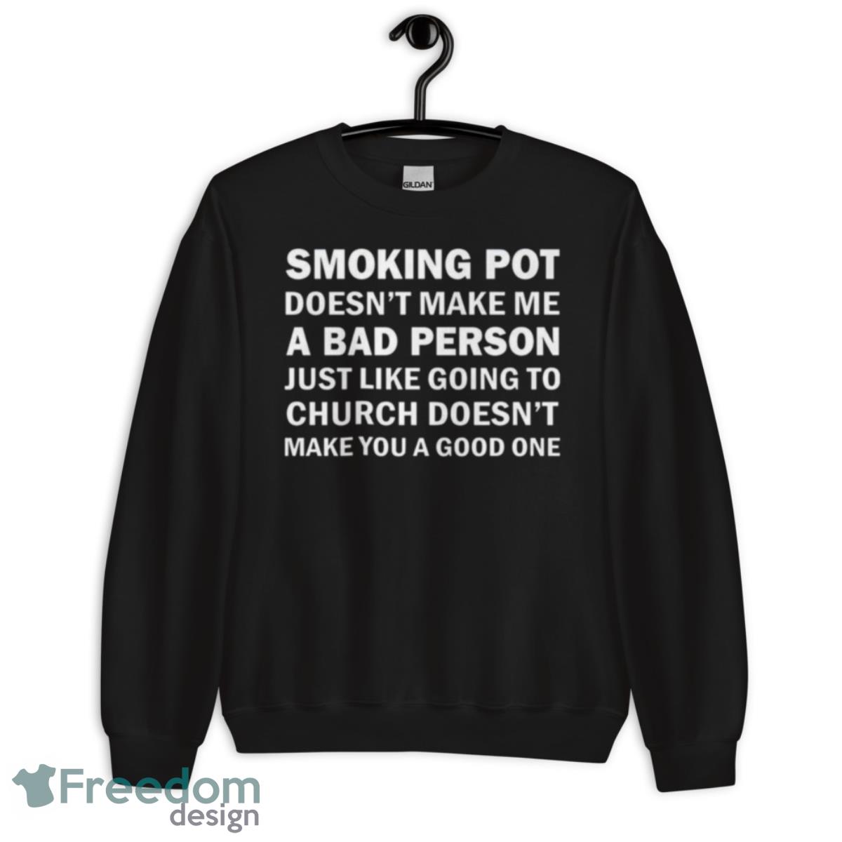 Smoking Pot Doesn’t Make Me A Bad Person Just Like Going To Church Doesn’t Make You A Good One Shirt Details