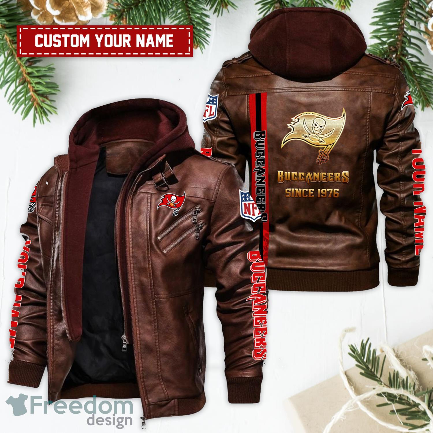 Some of the Tampa Bay Buccaneers Golden NFL Teams Custom Name Leather Jacket For Fans photos